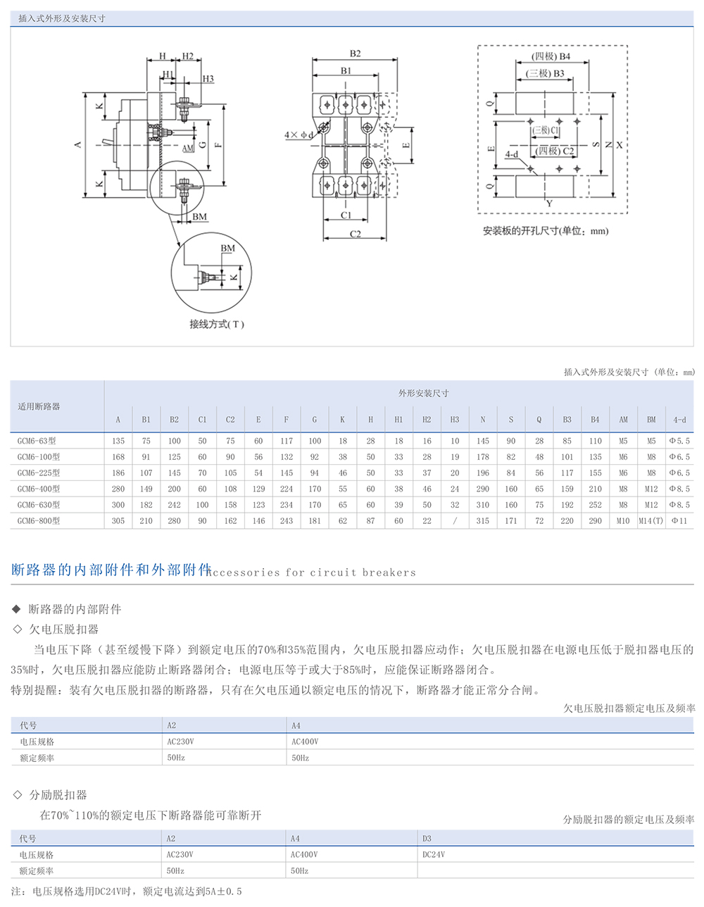 GCM6系列高電壓等級塑料外殼式斷路器|以下簡稱斷路器|主要用于交流50Hz或(60Hz),額定絕緣電壓1000V,額定工作電400V至1000V及以下,額定電流800A及以下的配電線路中作為分配電能和保護線路及電源設備的過載、欠電壓和短路保護。在正常情況下可作為線路的不頻繁轉換和電動機的不頻繁起動之用。產品符合: IEC 60947-2、GB/T 14048.2標準。